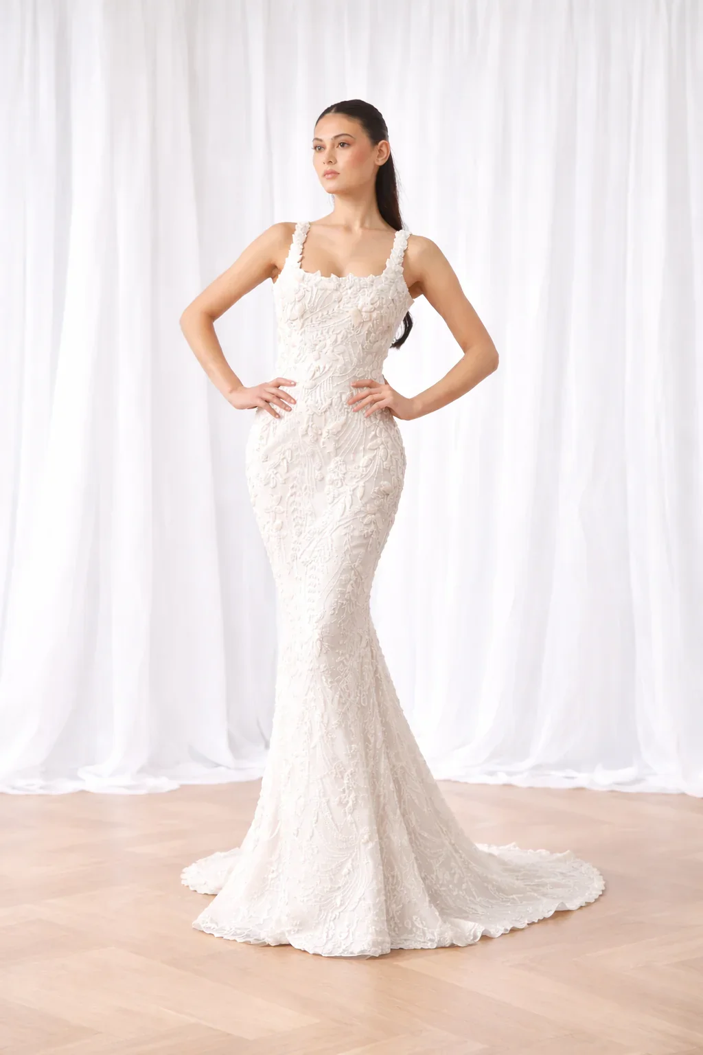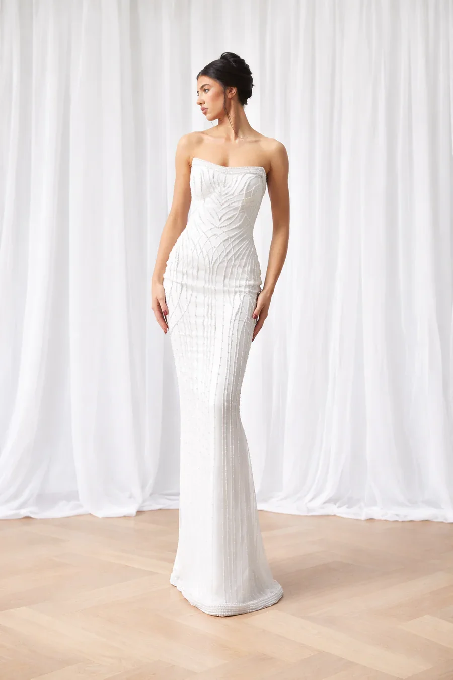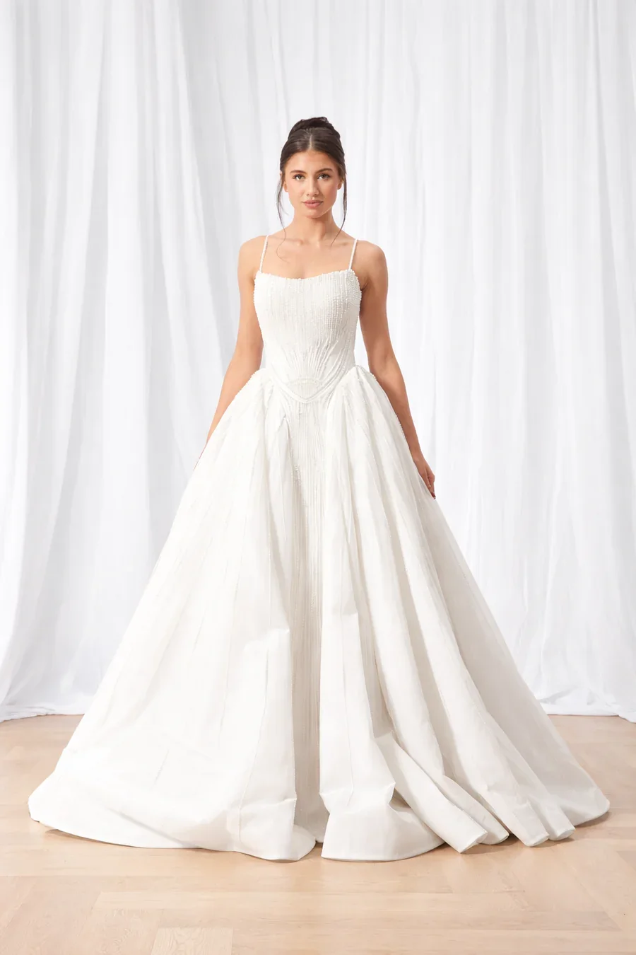 We offer a curated selection of luxury fabrics, including structured mikado, smooth liquid satin, delicate lace, airy tulle, and intricate hand-beaded embellishments. Each fabric is carefully sourced to provide the perfect balance of elegance, movement, and quality—allowing your gown to feel just as beautiful as it looks.